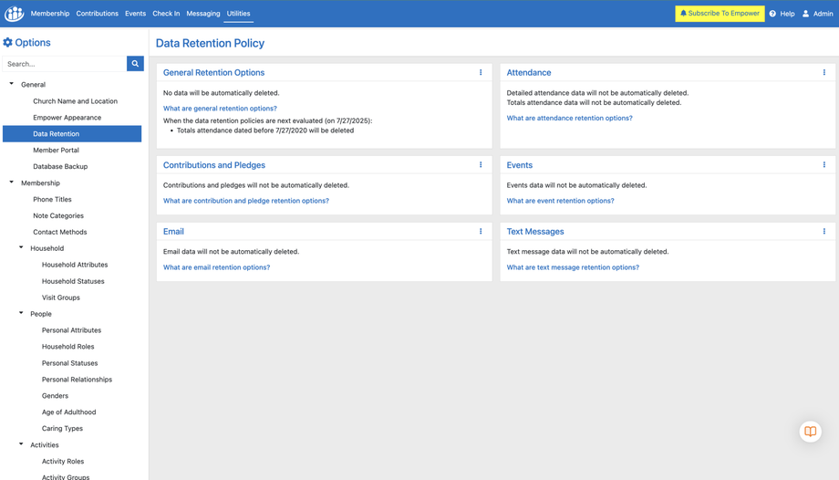 When you navigate to Utilities > Options in Empower, you will find the Data Retention Policy section, which allows you to manage how long different types of data are kept within the system. This feature is crucial for maintaining an organized database and ensuring compliance with any data retention guidelines your church may follow.